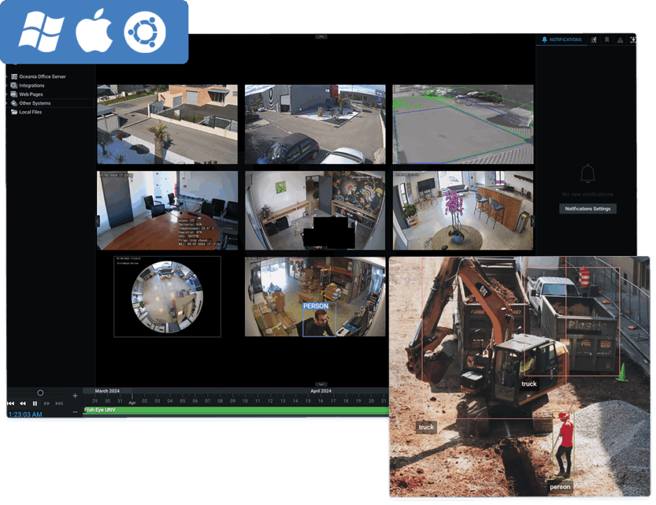 Nxデスクトップは、Nxシステムの一元管理、単拠点または多拠点の映像閲覧、アーカイブ検索、クラウドによる多拠点監視、カスタマイズ可能なレイアウトなど、多岐に渡ってセキュリティの利便性を高めます。